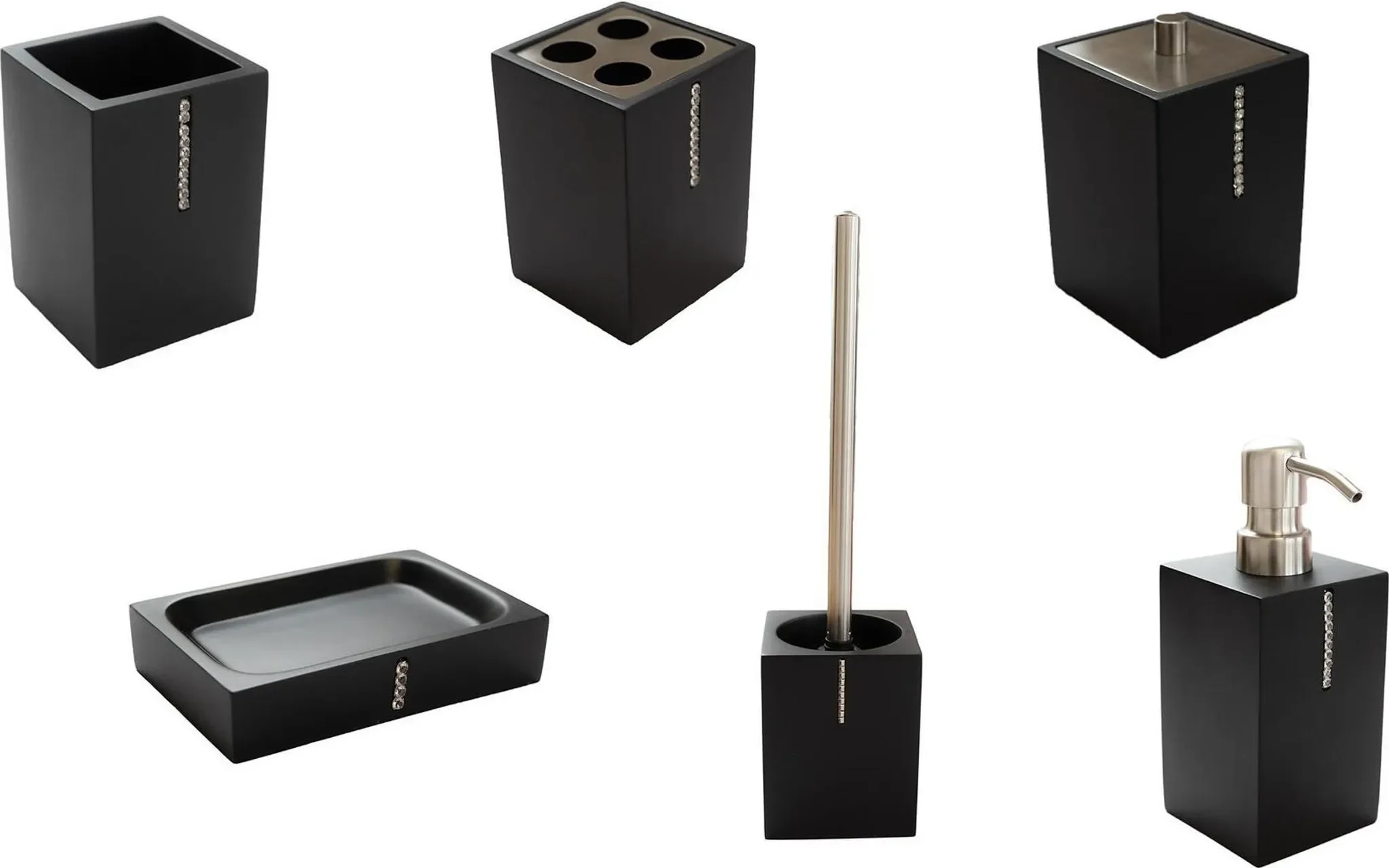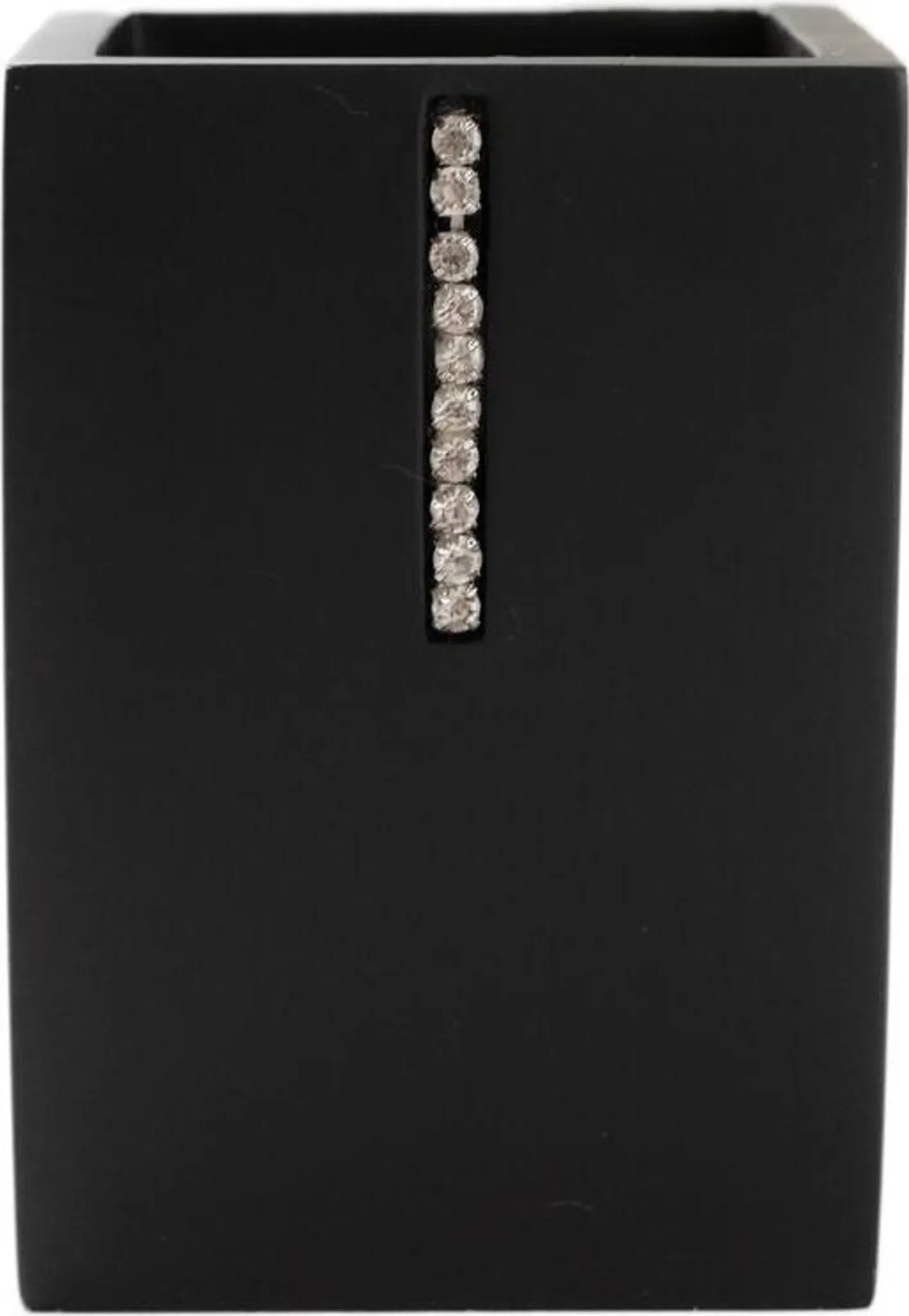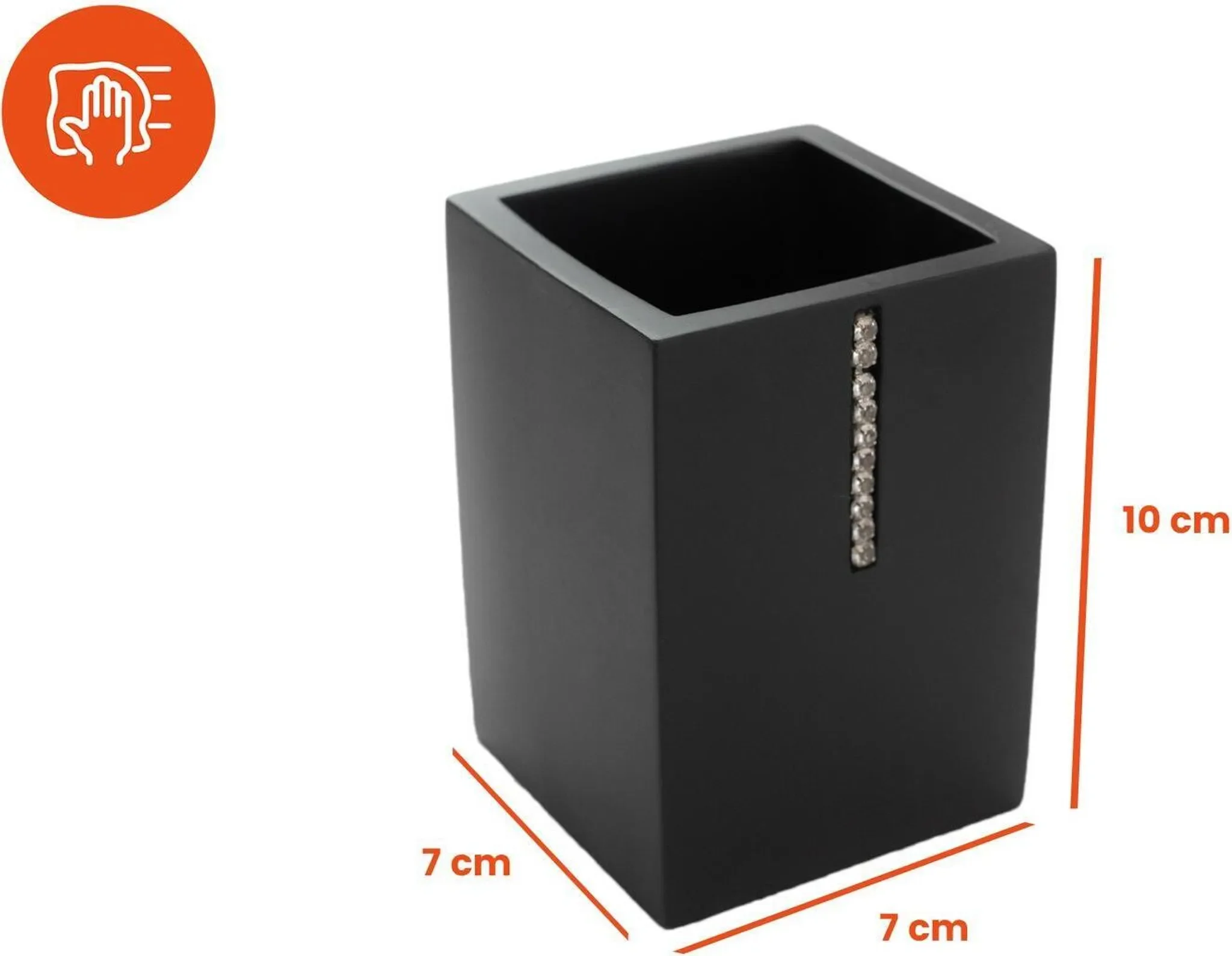 Der Zahnputzbecher von Bagnoxx aus hochwertigem Polyresin schafft Ordnung im Badezimmer und bietet Platz für Zahnbürsten, Zahnpasta und kleine Pflegeutensilien. Das edle Schwarz in Kombination mit dekorativen Strassdetails sorgt für einen modernen und stilvollen Akzent am Waschbecken.