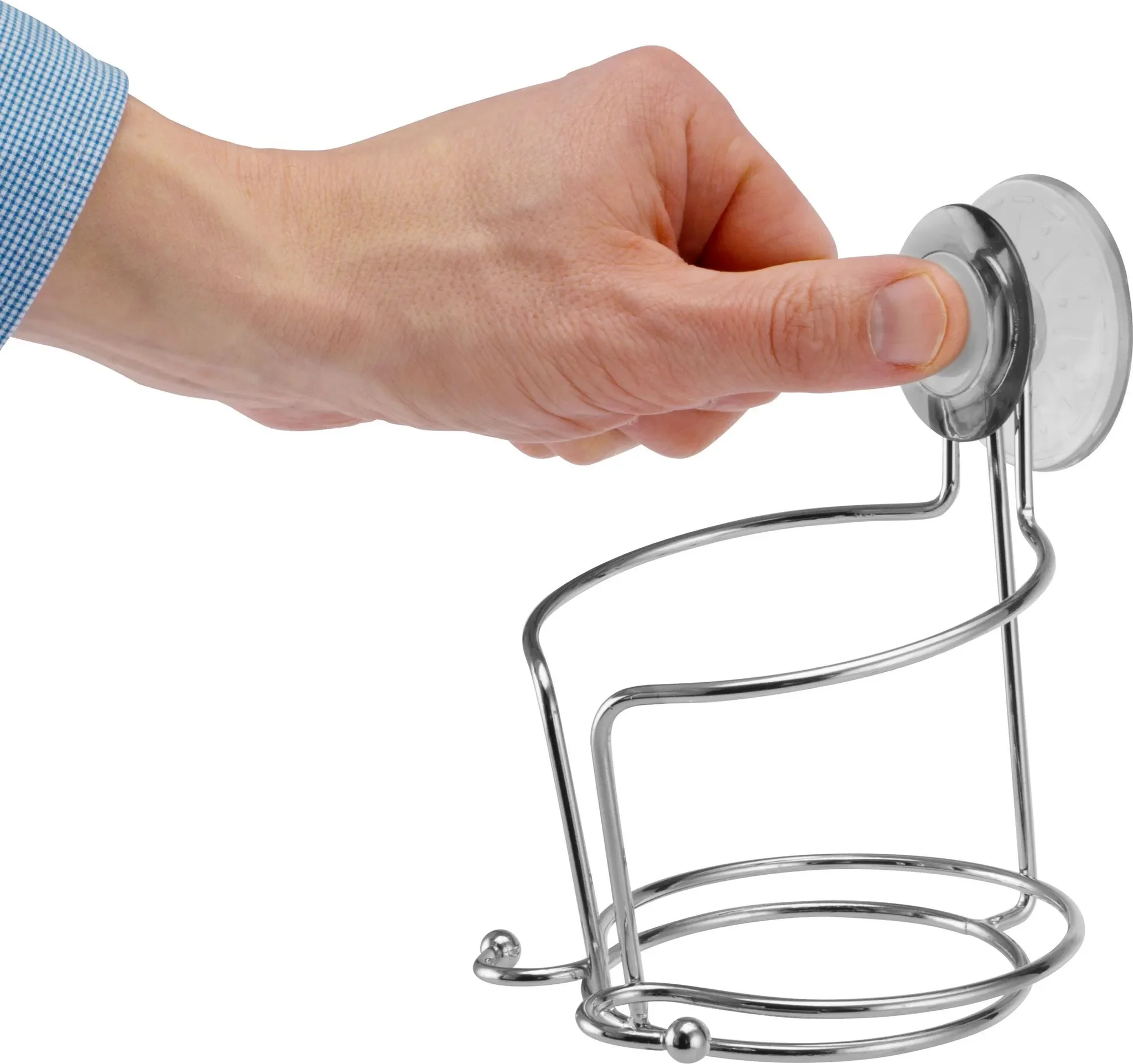 Die verchromte Metallkonstruktion sorgt für eine moderne, glänzende Optik und passt hervorragend zu typischen Badarmaturen. Der Halter kann rückstandslos entfernt und neu positioniert werden und bietet so maximale Flexibilität im Alltag.