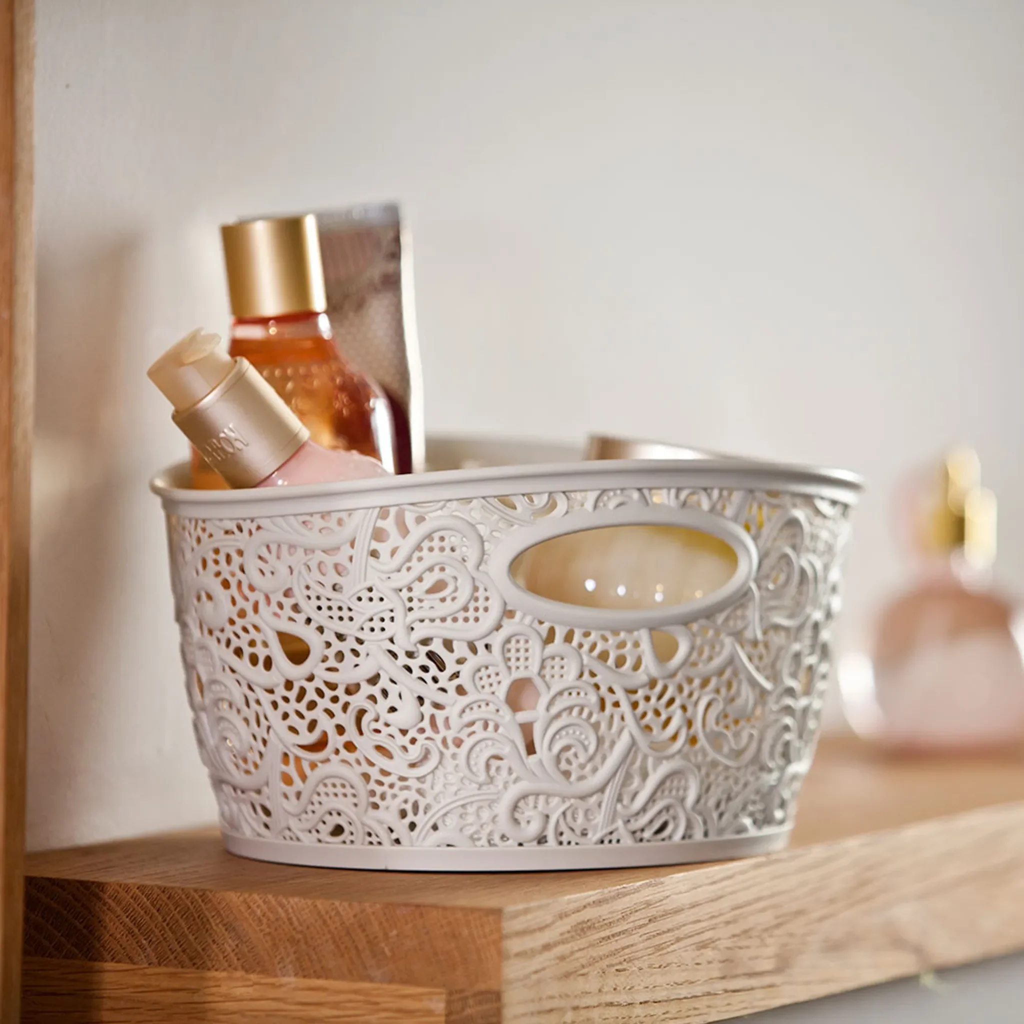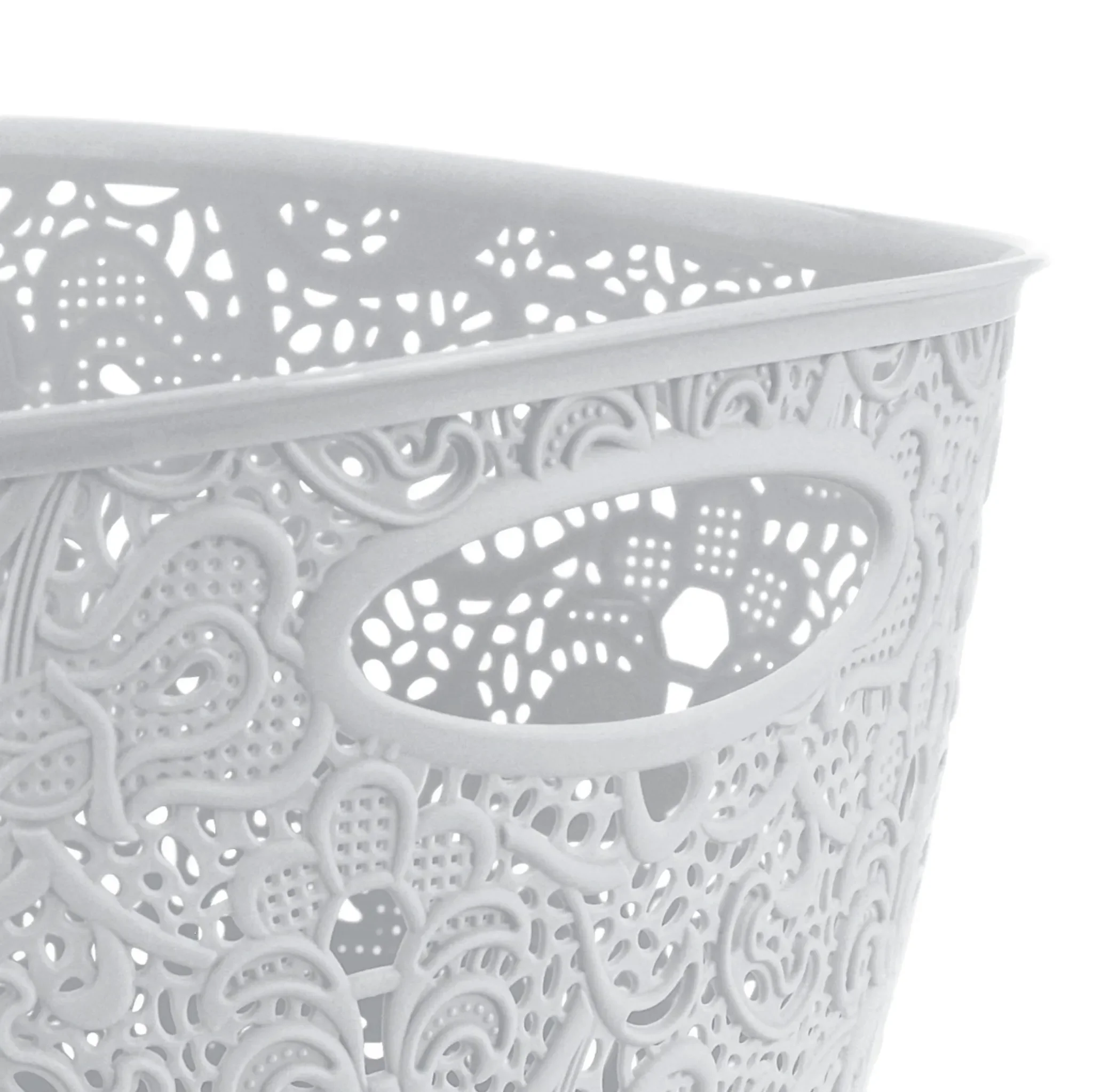 Der dekorative Aufbewahrungskorb „Victoria“ von Curver kombiniert funktionalen Stauraum mit eleganter Spitzenoptik. Die neutrale Cremefarbe ermöglicht einen harmonischen Einsatz in Wohn-, Bad-, Schlafzimmer- oder Bürobereichen und ergänzt moderne sowie klassische Inneneinrichtungen.