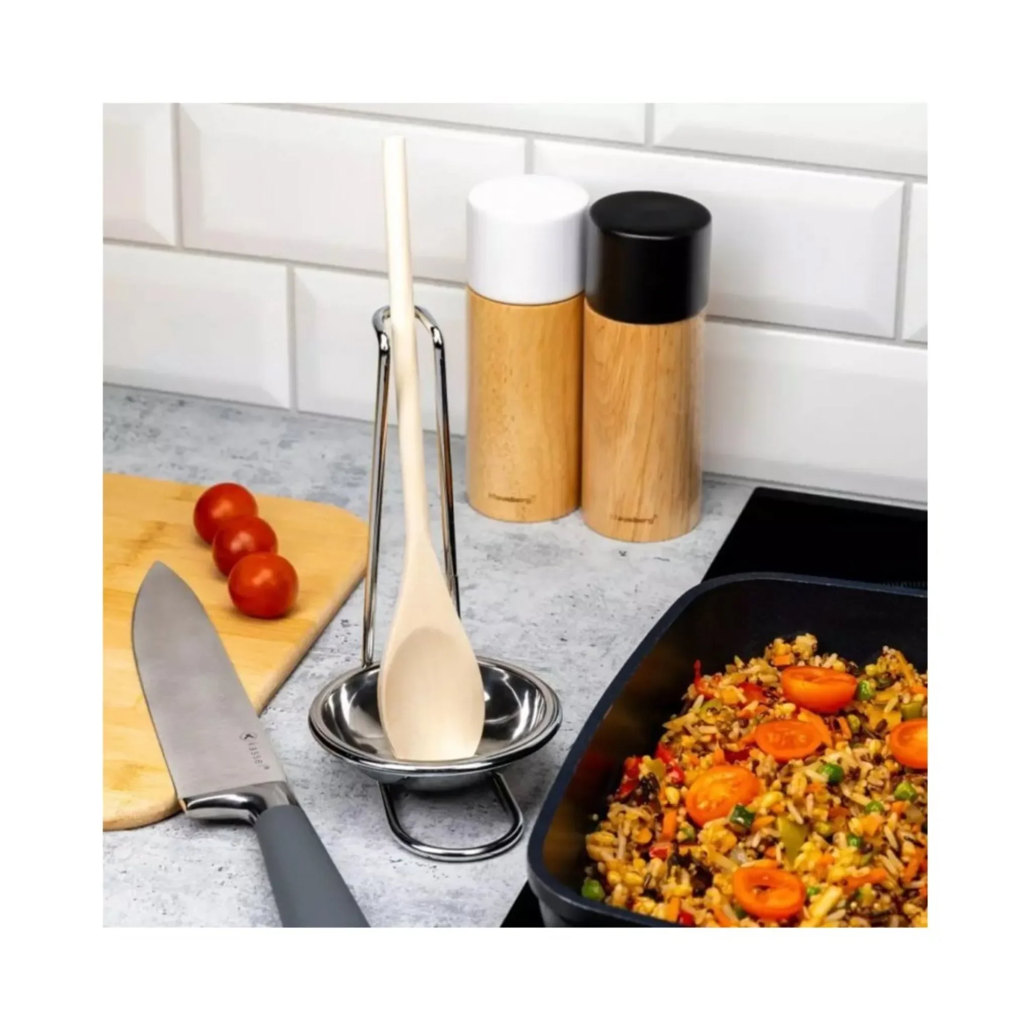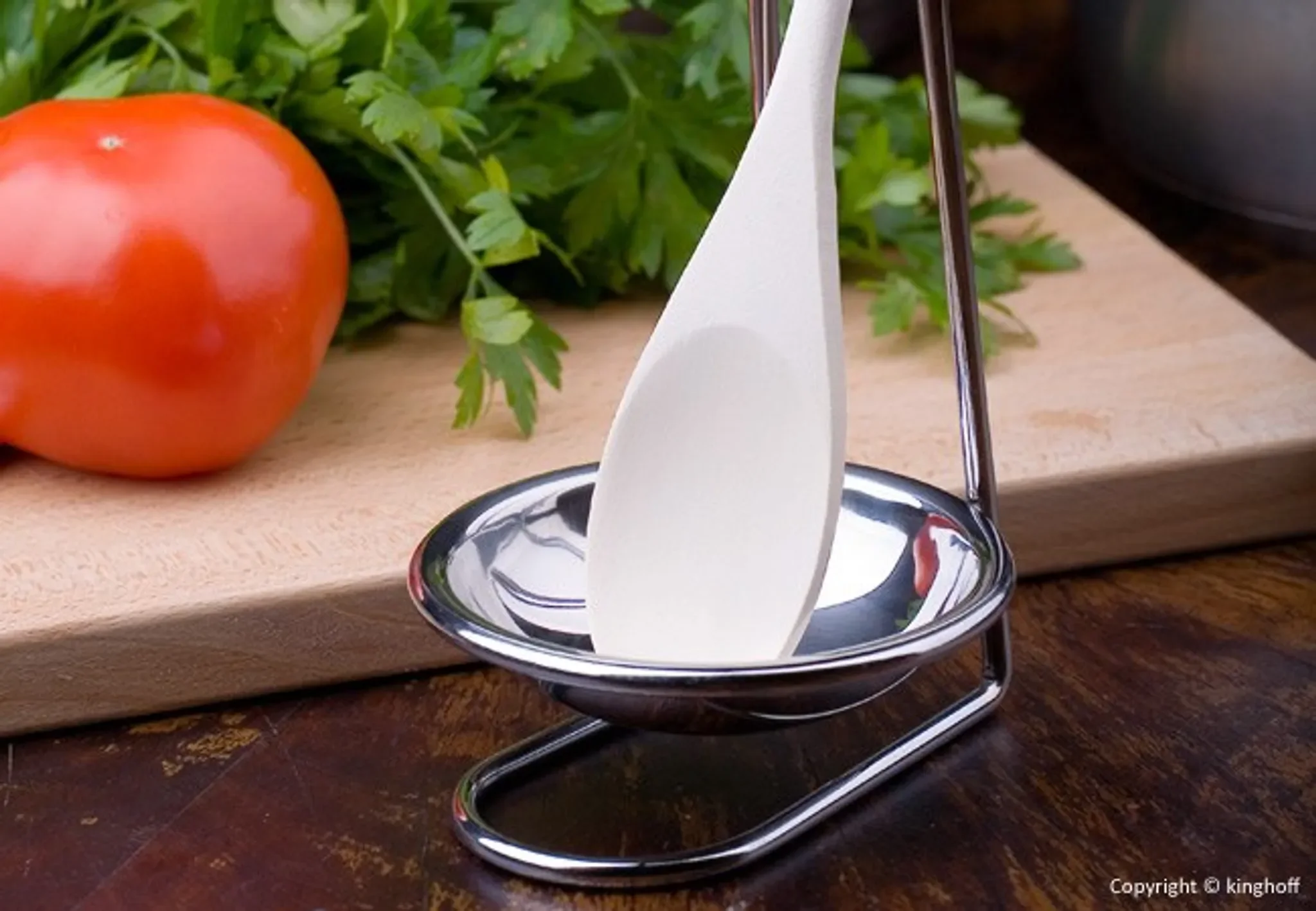 Der KINGhoff Ständer mit Holzlöffel kombiniert Funktionalität mit hochwertiger Verarbeitung. Der Edelstahlständer hält den beiliegenden Holzlöffel griffbereit, während die integrierte, abnehmbare Tropfschale für Sauberkeit beim Kochen sorgt.