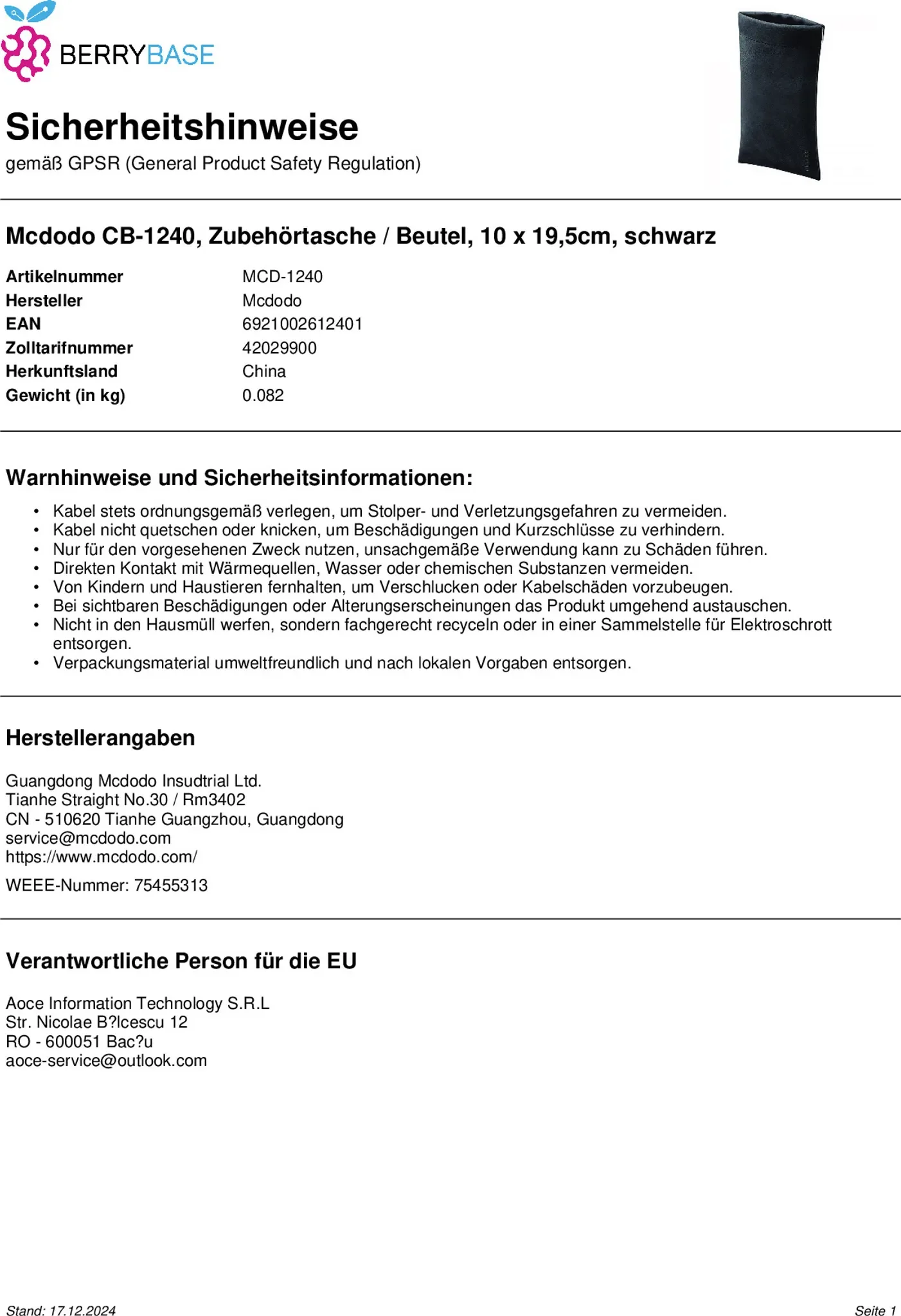 | Im Paket | 1 × Mcdodo Stow Bag L (schwarz) |