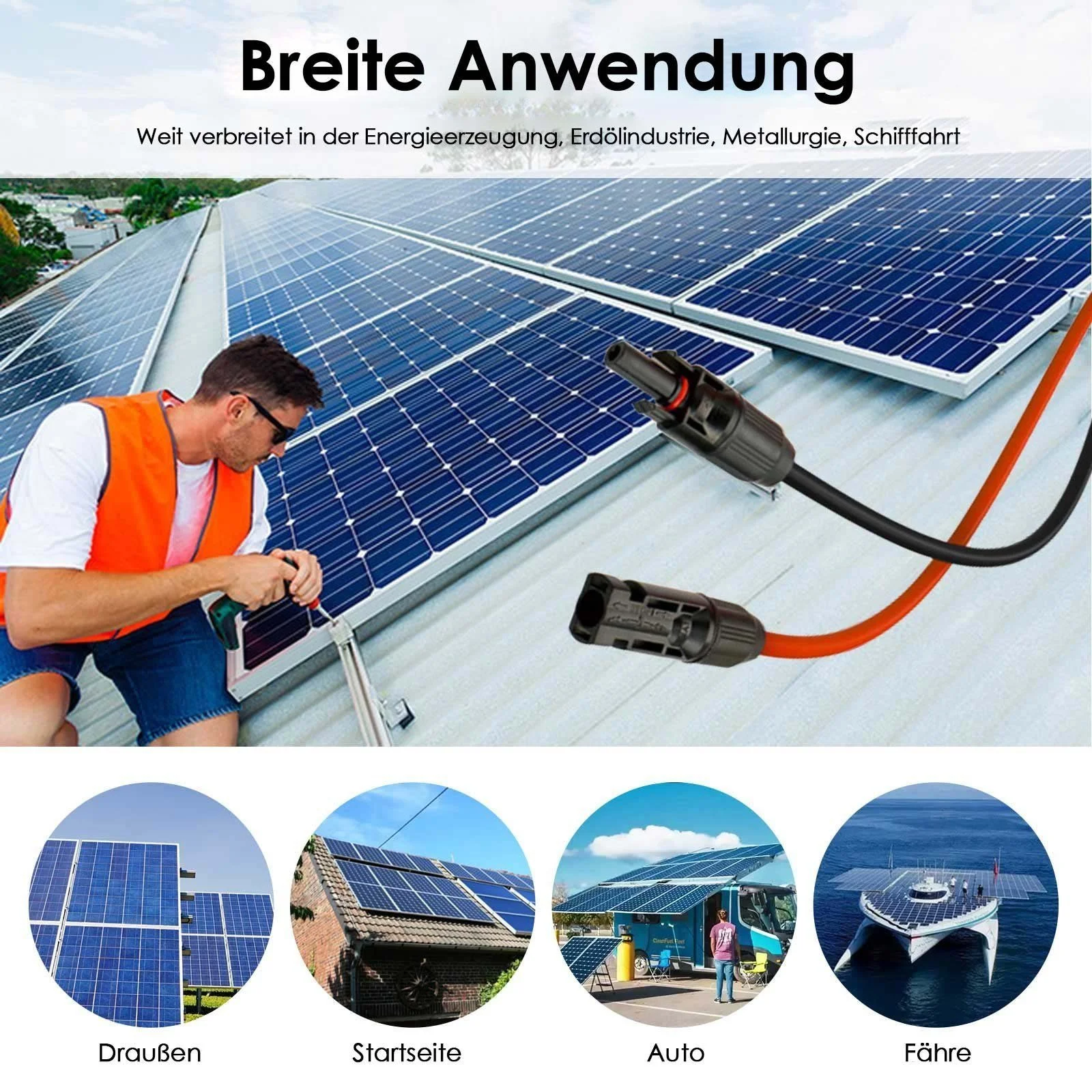 Highlights: einseitiger MC4-Anschluss für flexible Anpassung, sicherer Feuchtigkeitsschutz durch O-Ring, Outdoor-geeignet, ideal für PV-Module, Wohnwagen & Kleinanlagen, schnelle Montage/Entriegelung.